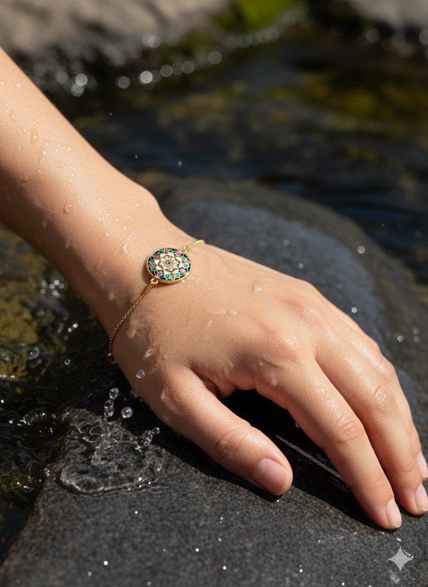 Inspiré de la beauté architecturale de Séville et des motifs du zellige marocain, le bracelet SEVILLARAN incarne l’élégance intemporelle et la finesse artisanale. Ses nuances vertes et roses contrastées sur fond doré révèlent une harmonie délicate entre tradition et modernité. Un bijou raffiné qui habille le poignet avec légèreté et caractère.
